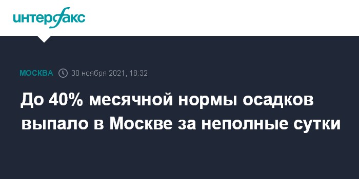 Москва. 30 ноября. INTERFAX.RU - В некоторых районах столицы с 21:00 понедельника выпало до 40% месячной нормы осадков в виде дождя, сообщается во вторник в телеграм-канале комплекса городского хозяйства.