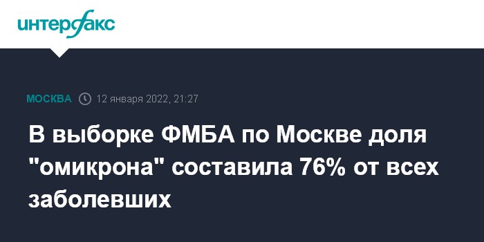 Москва. 12 января. INTERFAX.RU - Доля заболевших новым штаммом коронавируса "омикрон" в числе исследованных ФМБА пациентов с COVID-19 в Москве достигла 76%, сообщила в среду руководитель агентства Вероника Скворцова.