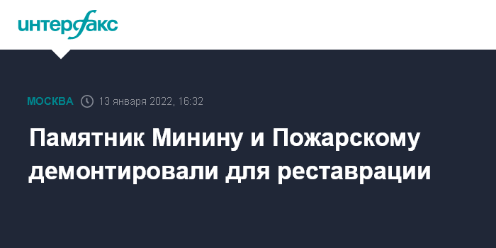 Москва. 13 января. INTERFAX.RU - Памятник Кузьме Минину и князю Дмитрию Пожарскому на Красной площади демонтировали для проведения реставрационных работ, сообщили в четверг "Интерфаксу" в Государственном историческом музее.