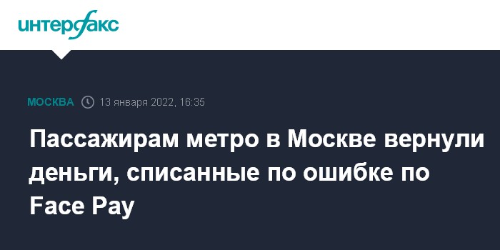Москва. 13 января. INTERFAX.RU - В московском метро у некоторых пассажиров, которые пользуются оплатой по Face Pay, были по ошибке списаны деньги. ВТБ вернул их на счета этих людей 12 января до 20:00, сообщили "Интерфаксу" в пресс-службе метрополитена.