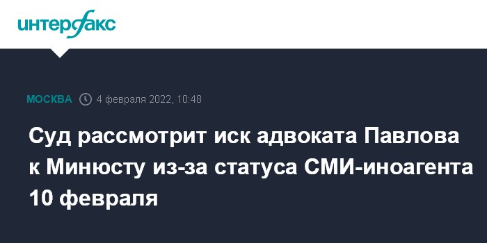 Москва. 4 февраля. INTERFAX.RU - Замоскворецкий суд Москвы 10 февраля рассмотрит иск руководителя правозащитного проекта "Первый отдел", адвоката Ивана Павлова (признан в РФ СМИ-иноагентом - ИФ) к Минюсту.