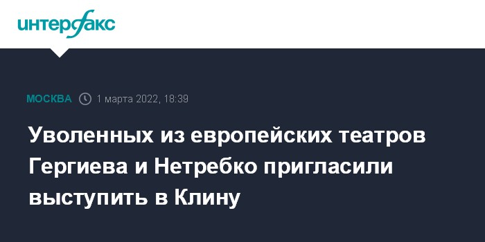 Москва. 1 марта. INTERFAX.RU - Дирижера Валерия Гергиева и оперную певицу Анну Нетребко, с которыми прекратили сотрудничество европейские театры, приглашают выступить на международном фестивале искусств имени Чайковского в Клину, сообщила министр культуры Московской области Елена Харламова.