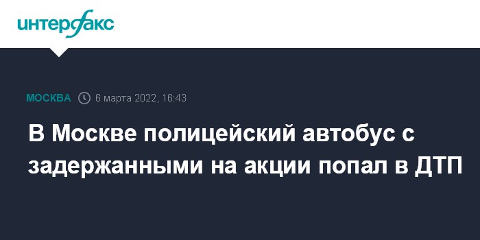 Москва. 6 марта. INTERFAX.RU - Полицейский автобус с задержанными за участие в несанкционированном мероприятии в Москве попал в аварию, есть пострадавшие, сообщили в воскресенье в пресс-службе столичного управления МВД.