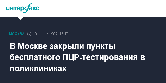 Москва. 13 апреля. INTERFAX.RU - В связи с улучшением эпидемиологической обстановки в Москве и снижением спроса в мэрии решили закрыть пункты бесплатного ПЦР-тестирования при поликлиниках, сообщили "Интерфаксу" в городском Департаменте здравоохранения.