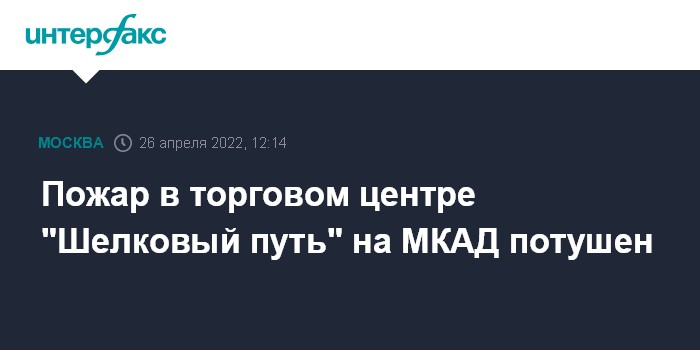 Москва. 26 апреля. INTERFAX.RU - Пожар в торговом центре "Шелковый путь" на 32-м км МКАД полностью потушен, сообщила во вторник "Интерфаксу" пресс-служба подмосковного главка МЧС.