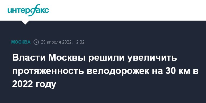 Москва. 29 апреля. INTERFAX.RU - В Москве в 2022 году власти планируют проложить еще около 30 км велодорожек в общей сложности, заявил "Первому каналу" заммэра города Максим Ликсутов.