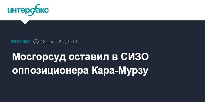 Москва. 18 мая. INTERFAX.RU - Московский городской суд отказал в удовлетворении апелляционной жалобы оппозиционера, общественного деятеля Владимира Кара-Мурзы (признан в РФ иноагентом), арестованного по обвинению в распространении заведомо ложной информации об использовании Вооруженных сил РФ, передает корреспондент "Интерфакса" из зала суда в среду.