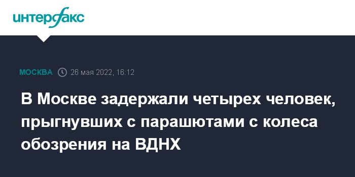 Москва. 26 мая. INTERFAX.RU - Четверо мужчин прыгнули с парашютами со строящегося колеса обозрения в парке ВДНХ, их задержала полиция, сообщила в четверг пресс-служба ГУ МВД России по Москве.