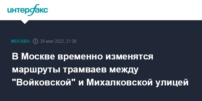 Москва. 26 мая. INTERFAX.RU - В Москве с 28 мая по выходным не будут ходить трамваи между станцией метро "Войковская" и Михалковской улицей, сообщил телеграм-канал городского Департамента транспорта. Это необходимо в связи с ремонтом на улице Зои и Александра Космодемьянских.