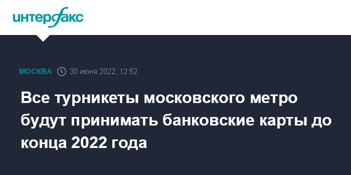 Москва. 30 июня. INTERFAX.RU - Новые турникеты с функцией оплаты проезда банковской картой появятся на всех станциях столичного метро до конца текущего года, сообщил "Интерфаксу" заммэра Москвы по вопросам транспорта Максим Ликсутов.