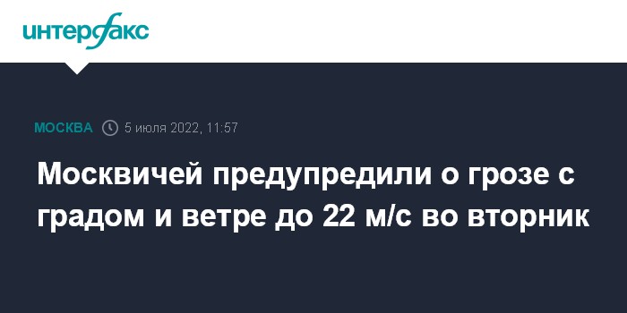 Москвичей предупредили о грозе с градом и ветре до 22 м/с во вторник