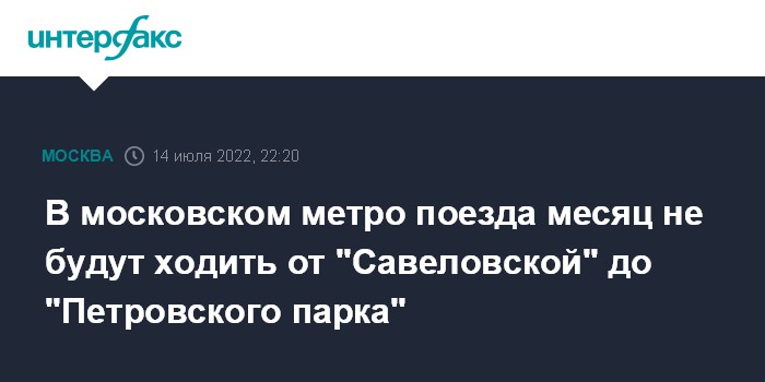 Москва. 14 июля. INTERFAX.RU - В московском метро с 23 июля по 22 августа не будут ходить поезда от станции "Савеловская" до "Петровского парка", предупредил городской Департамент транспорта.
