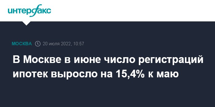 Москва. 20 июля. INTERFAX.RU - В Москве в июне число зарегистрированных ипотек выросло на 15,4% за месяц, сообщили в пресс-службе столичного Управления Росреестра.