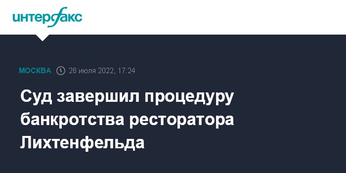 Москва. 26 июля. INTERFAX.RU - Арбитражный суд Москвы завершил процедуру банкротства московского ресторатора Ильи Лихтенфельда и освободил его "от дальнейшего исполнения требований кредиторов, в том числе требований кредиторов, не заявленных при введении реализации имущества гражданина".