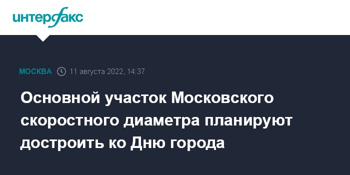 Москва. 11 августа. INTERFAX.RU - Участок новой дороги Московского скоростного диаметра (МСД) от Ярославского до Дмитровского шоссе планируют достроить ко Дню города в 2022 году, сообщил мэр столицы Сергей Собянин.