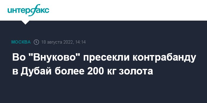 Москва. 18 августа. INTERFAX.RU - Сотрудники таможни московского аэропорта "Внуково" пресекли попытку вывоза 225 кг золота стоимостью около 800 млн рублей из России в Дубай, сообщает пресс-служба Федеральной таможенной службы (ФТС) в четверг.
