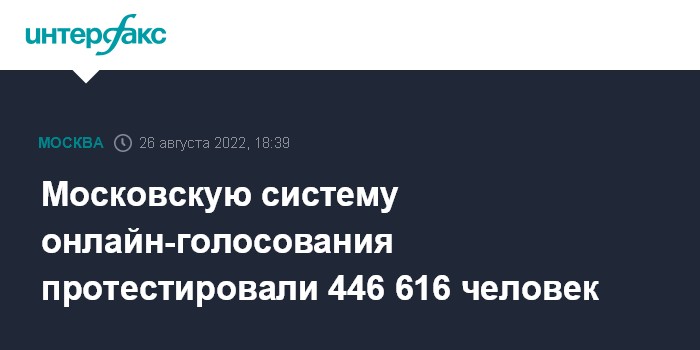 Москва. 26 августа. INTERFAX.RU - В тестировании московской системы онлайн-голосования 26 августа приняли участие 446 616 человек, на традиционные участки пришел 11 381 избиратель, сообщил сайт мэрии.