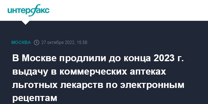 Отмечается, что правительство Москвы приняло решение продлить до 31 декабря 2023 года реализацию пилотного проекта по обеспечению отдельных льготных категорий граждан бесплатными лекарственными препаратами в коммерческих аптеках по электронным рецептам.