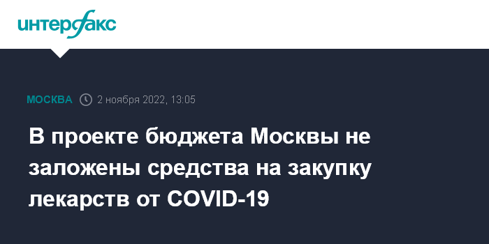 Москва. 2 ноября. INTERFAX.RU - В проекте бюджета Москвы не заложены средства на закупку лекарств для лечения коронавирусной инфекции, так как создан необходимый запас препаратов на первый квартал 2023 года, сообщила в Мосгордуме замруководителя городского Департамента здравоохранения Элла Попова.