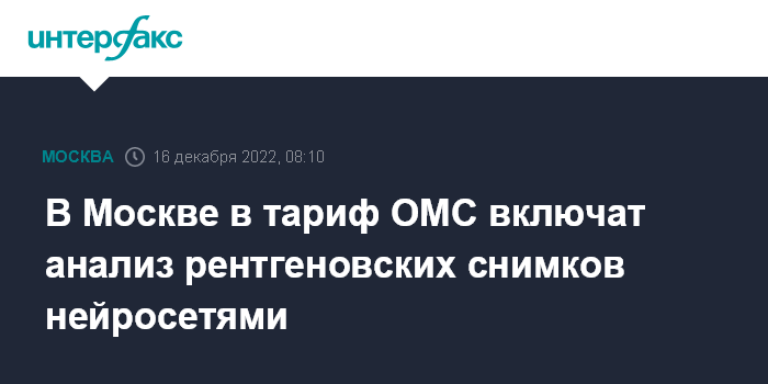 Москва. 16 декабря. INTERFAX.RU - В 2023 году в тариф ОМС в Москве добавят анализ рентгеновских снимков с помощью нейросетей, сообщила на форуме "Моя поликлиника" заммэра города по вопросам социального развития Анастасия Ракова.