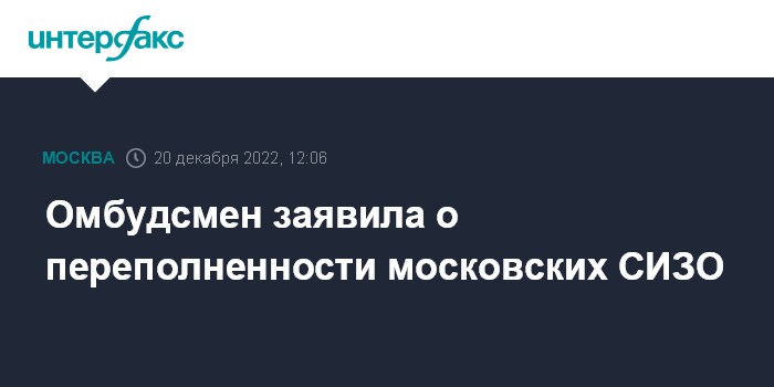 Москва. 20 декабря. INTERFAX.RU - Переполненность московских следственных изоляторов в 2022 году выросла с 11% до 22,6% по сравнению с прошлым годом, заявила во вторник уполномоченный по правам человека в Москве Татьяна Потяева.