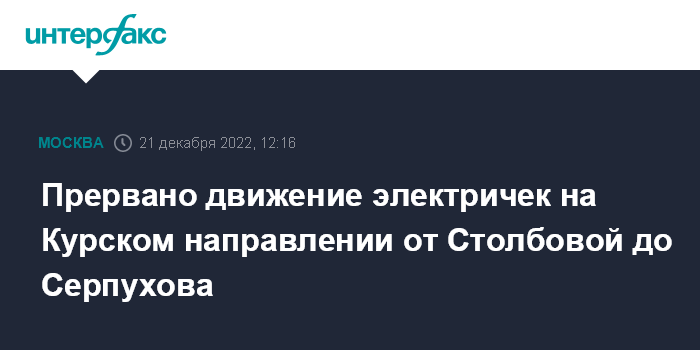 Москва. 21 декабря. INTERFAX.RU - На Курском направлении Московской железной дороге прервано движение поездов на участке Столбовая-Серпухов, сообщила Центральная пригородная пассажирская компания (ЦППК).
