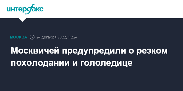 Москва. 24 декабря. INTERFAX.RU - По прогнозам синоптиков, вечером в Москве ожидается понижение температуры воздуха до минус 6-11 градусов, что будет способствовать образованию сильной гололедицы, сообщается в телеграм-канале комплекса городского хозяйства в субботу.