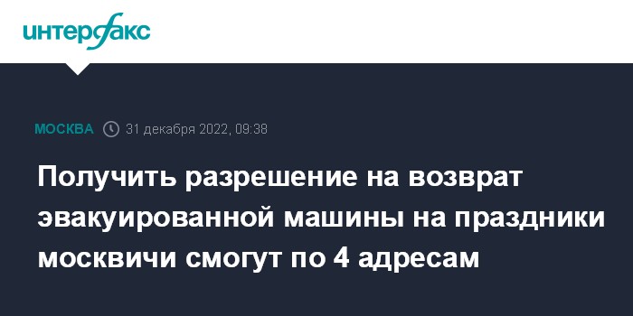 Сервисный центр "Московский транспорт" (Старая Басманная улица, дом 20, корпус 1) закрыт 31 декабря, 1 и 7 января. В другие праздничные дни разрешения на возврат автомобиля там будут выдавать с 08:00 до 20:00.