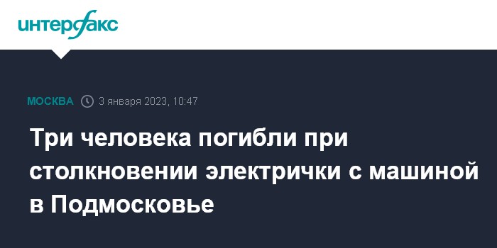 Москва. 3 января. INTERFAX.RU - Столкновение автомобиля и электропоезда произошло на переезде около станции "Ивантеевка" Ярославского направления, в результате ДТП три человека погибли, сообщила пресс-служба Главного управления МВД России по Московской области во вторник.