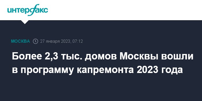 Москва. 27 января. INTERFAX.RU - Реализация программы капитального ремонта жилья продолжается в столице, в 2023 году обновят свыше 2,3 тыс. многоквартирных домов, сообщил заместитель мэра Москвы Петр Бирюков.