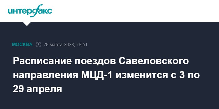 Москва. 29 марта. INTERFAX.RU - Расписание поездов на Савеловском направлении первой линии Московских центральных диаметров (МЦД-1, D1) изменится с 3 по 29 апреля из-за строительства ТПУ "Лианозово". Об этом сообщает телеграм-канал департамента транспорта Москвы.