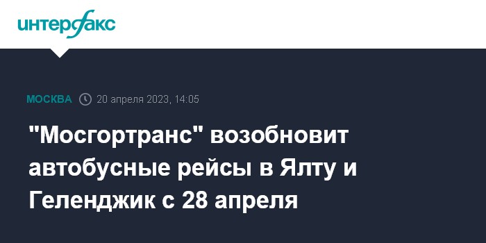 Москва. 20 апреля. INTERFAX.RU - "Мосгортранс" с 28 апреля возобновляет отправление автобусов из Москвы в Ялту и Геленджик, сообщил через пресс-службу городского Департамента транспорта заммэра столицы Максим Ликсутов.