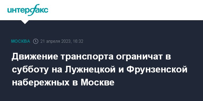 Москва. 21 апреля. INTERFAX.RU - В Госавтоинспекции Москвы сообщили об ограничении в движении транспорта в субботу, 22 апреля, на участках Лужнецкой и Фрунзенской набережных в связи с проведением "Лиги триатлона".