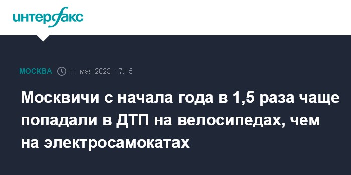 Москва. 11 мая. INTERFAX.RU - В Москве с января по апрель 2023 года число дорожных аварий с участием велосипедистов оказалось в полтора раза больше количества ДТП с участием пользователей средств индивидуальной мобильности, сообщили в пресс-службе столичного главка Госавтоинспекции.