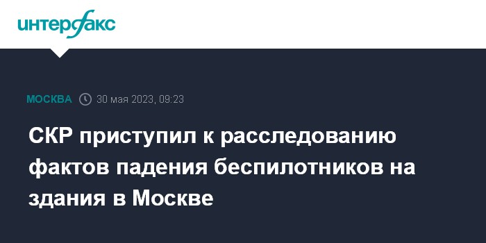 Москва. 30 мая. INTERFAX.RU - Следователи приступили к расследованию фактов падения беспилотников на здания в Москве, сообщает телеграм-канал Следственного комитета РФ (СКР).