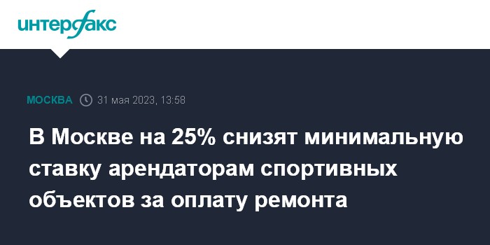 Москва. 31 мая. INTERFAX.RU - В Москве минимальная ставка аренды для инвесторов, вкладывающих деньги в ремонт спортивных объектов, снизится на 25%, сообщил в Telegram мэр города Сергей Собянин.