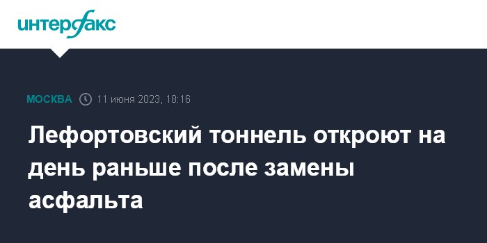 Москва. 11 июня. INTERFAX.RU - Движение автотранспорта по Лефортовскому тоннелю, закрытому в ночь на субботу, возобновится до 19:00, сообщается в телеграм-канале комплекса городского хозяйства в воскресенье.
