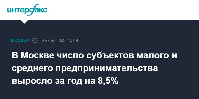 Москва. 16 июня. INTERFAX.RU - В реестре субъектов малого и среднего предпринимательства (МСП) зарегистрировано почти 890 тыс. московских компаний и индивидуальных предпринимателей; за год количество субъектов МСП выросло на 8,5%. Об этом сообщил заммэра Москвы по вопросам экономической политики и имущественно-земельных отношений Владимир Ефимов.
