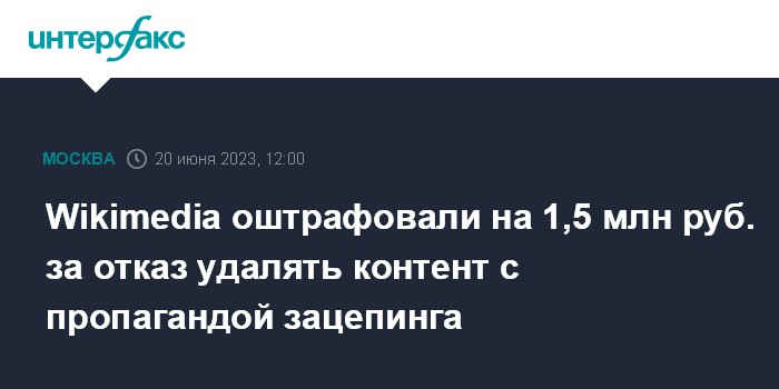 Москва. 20 июня. INTERFAX.RU - Мировой судья в Москве назначил административный штраф в размере 1,5 млн руб. фонду Wikimedia за неудаление из "Википедии" контента, содержащего пропаганду зацепинга, передал корреспондент "Интерфакса".