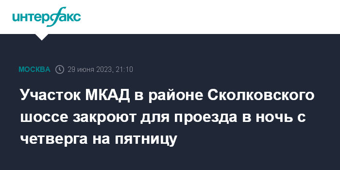 Москва. 29 июня. INTERFAX.RU - Движение на участке МКАД между пересечениями со Сколковским и Можайским шоссе будет закрыто для проезда транспорта в ночь с 29 на 30 июня. Об этом сообщила в четверг пресс-служба департамента транспорта Москвы.
