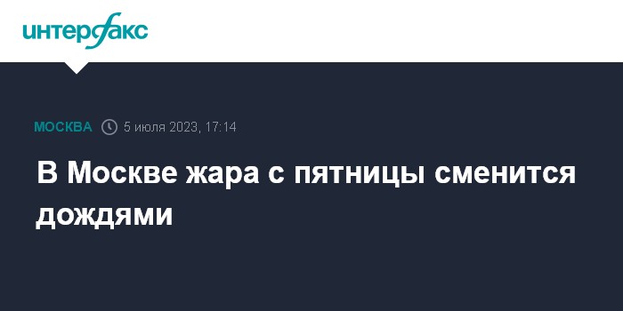 Москва. 5 июля. INTERFAX.RU - В столичном регионе погода с жарой до плюс 32 градусов с пятницы сменится дождями и понижением температуры до плюс 24 - 25 градусов, на следующей неделе, по предварительным прогнозам, похолодает до плюс 19-23 градусов, сообщил "Интерфаксу" научный руководитель Гидрометцентра России Роман Вильфанд.