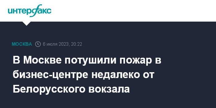 Москва. 6 июля. INTERFAX.RU - Пожарные потушили возгорание в Москве в бизнес-центре недалеко от Белорусского вокзала, сообщила пресс-служба департамента по делам гражданской обороны, чрезвычайным ситуациям и пожарной безопасности столицы в четверг.