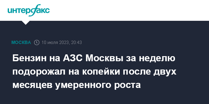 Москва. 10 июля. INTERFAX.RU - Рост розничных цен на бензин в Москве замедлился до копеечных темпов, свидетельствуют данные Московской топливной ассоциации (МТА).