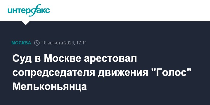 Москва. 18 августа. INTERFAX.RU - Басманный суд Москвы по ходатайству следствия арестовал сопредседателя движения "Голос" (признано в РФ иноагентом) Григория Мельконьянца, задержанного по делу о деятельности нежелательной в РФ организации, сообщили "Интерфаксу" в суде.