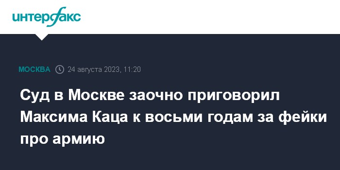 Москва. 24 августа. INTERFAX.RU - Басманный суд Москвы заочно назначил восемь лет колонии общего режима оппозиционеру и блогеру Максиму Кацу (признан в РФ иноагентом) по делу о распространении ложной информации про действия Вооруженных сил РФ, сообщили "Интерфаксу" в суде в четверг.