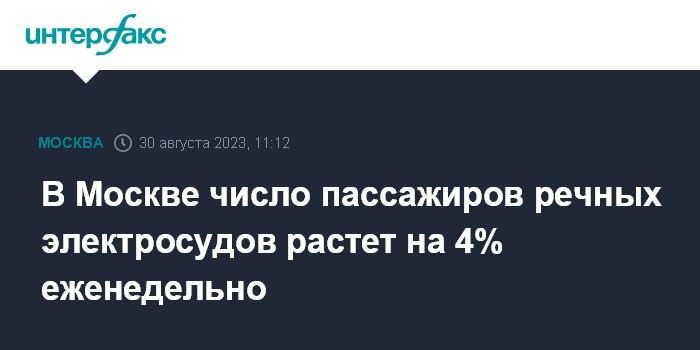 Москва. 30 августа. INTERFAX.RU - В Москве каждую неделю число пассажиров, совершающих поездки на электросудах, повышается примерно на 4%, сообщил через пресс-службу Дептранса заммэра города Максим Ликсутов.