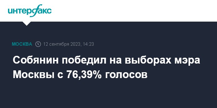 Москва. 12 сентября. INTERFAX.RU - Сергей Собянин победил на выборах мэра Москвы с 76,39% голосов, следует из итоговых данных Мосгоризбиркома (МГИК).