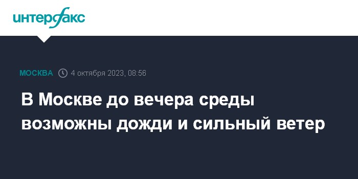 "В период с 13:00 до 20:00 (...) 4 октября по городу Москве ожидается усиление юго-западного, западного ветра с порывами 15-20 м/с, дождь, местами гроза", - говорится в сообщении.