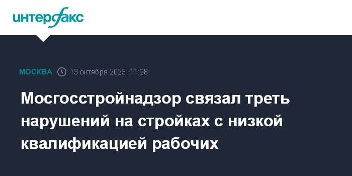 Москва. 13 октября. INTERFAX.RU - Свыше 30% нарушений на строительных площадках Москвы связаны с низкой квалификацией рабочего персонала, заявил на брифинге председатель Мосгосстройнадзора Игорь Войстратенко.