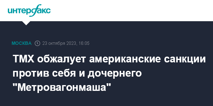 Москва. 23 октября. INTERFAX.RU - АО "Трансмашхолдинг" (ТМХ) обжалует американские санкции против себя и своего дочернего предприятия АО "Метровагонмаш", сообщил журналистам генеральный директор компании Кирилл Липа.